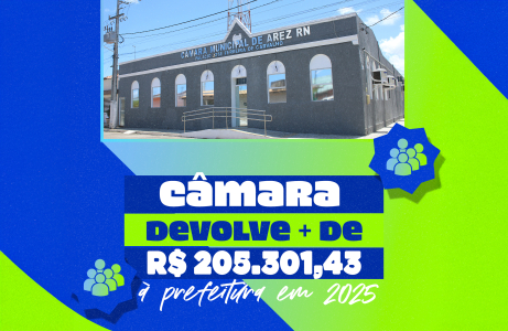 A Câmara Municipal de Arez devolve R$ 205.301,43 ao Tesouro Municipal, saldo remanescente do duodécimo de 2025, comprovado por transferência anexa. Resultado de gestão eficiente e econômica, sem subinvestimento, modernizando processos, qualificando estruturas e ampliando serviços via Programa Câmara Cidadã.
